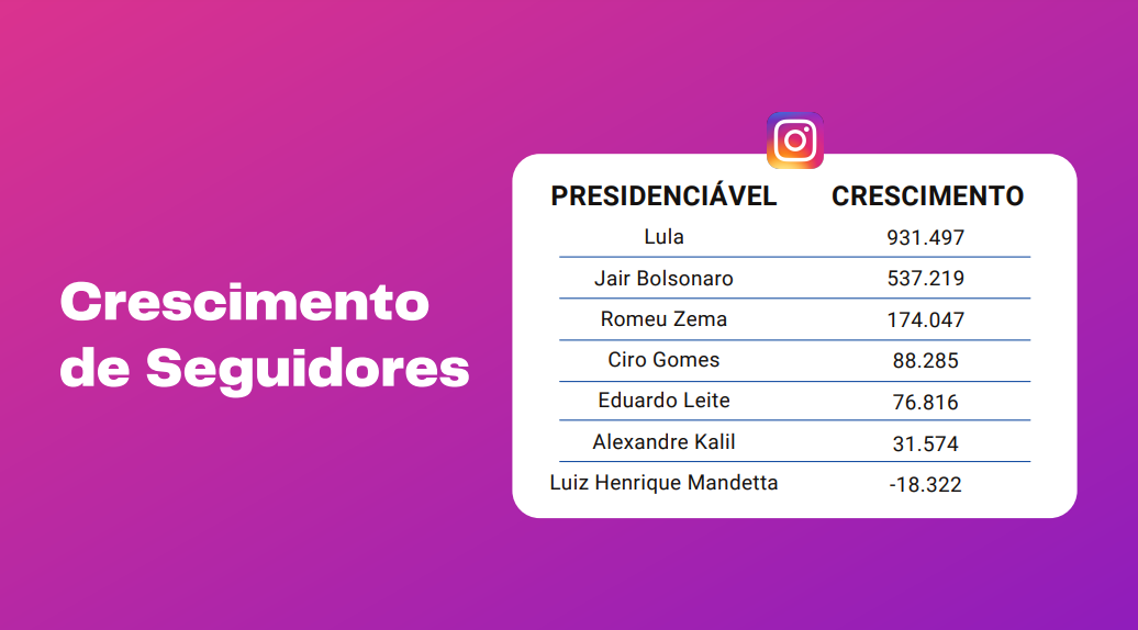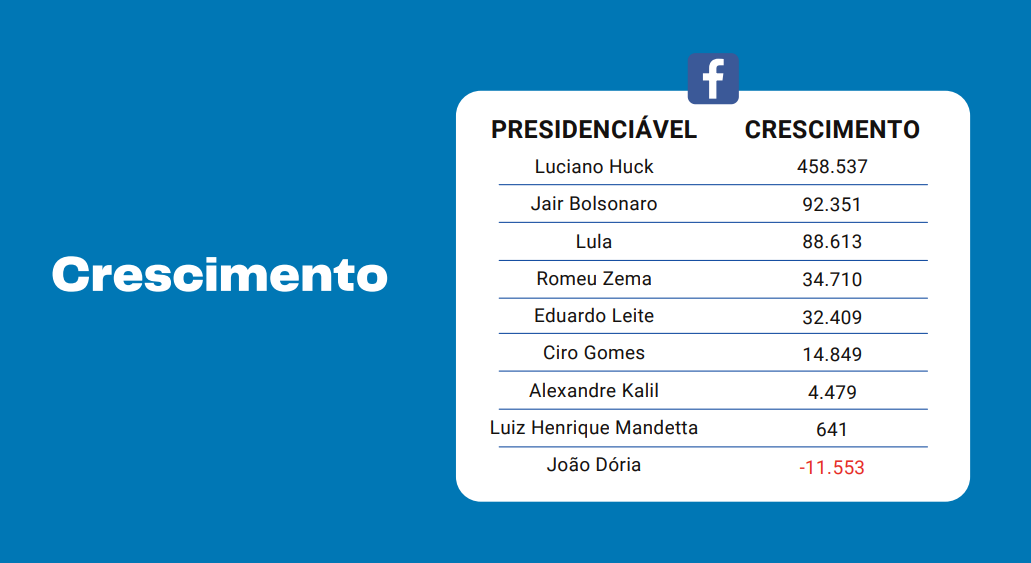 No período analisado, o único que perdeu seguidores no Facebook foi Doria. O tucano, eleito com o slogan BolsoDoria, entrou em rota de coalização com o presidente após apostar na Coranavac, vacina produzida pela chinesa Sinovac em conjunto com o Instituto Butantan. No Instagram, a mesma situação se passou com o ex-ministro da Saúde Mandetta.