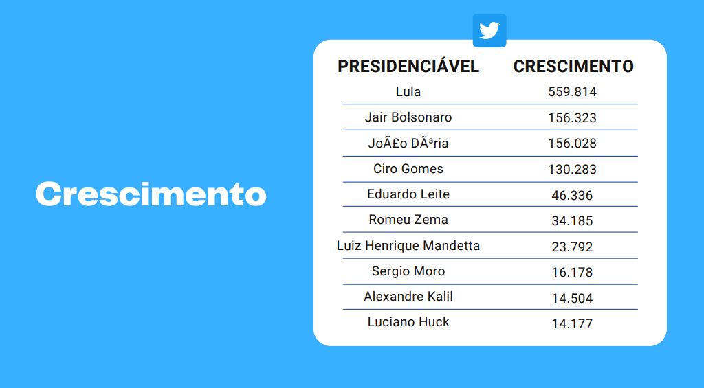 No estudo, que teve como objeto levantar dados e analisar a perfomance digital dos pré-candidatos, ainda aparecem os nomes de Ciro Gomes (PDT), o governador de São Paulo, João Doria (PSDB), Luiz Henrique Mandetta (DEM), o ex-juiz Sérgio Moro, o prefeito de Belo Horizonte, Alexandre Kalil (PSD), o governador de Minas Gerais, Romeu Zema (Novo), o governador do Rio Grande do Sul, Eduardo Leite (PSDB), e do apresentador Luciano Huck, que decidiu continuar na TV Globo.