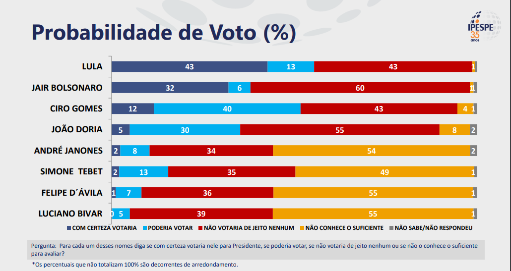 O principal adversário de Bolsonaro na corrida eleitoral, Lula (PT), tem uma taxa de 43% que dizem não votar no petista de jeito nenhum.
