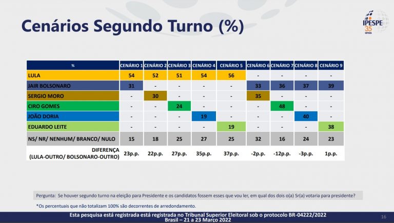 Nos cenários de segundo turno monitorados pelo Ipespe, Lula venceria todos os adversários por uma diferença superior a 20 pontos percentuais. Em todos os casos, o petista mantém um patamar superior a 50% das indicações de voto. Bolsonaro, por sua vez, só venceria Eduardo Leite. Veja os resultados: