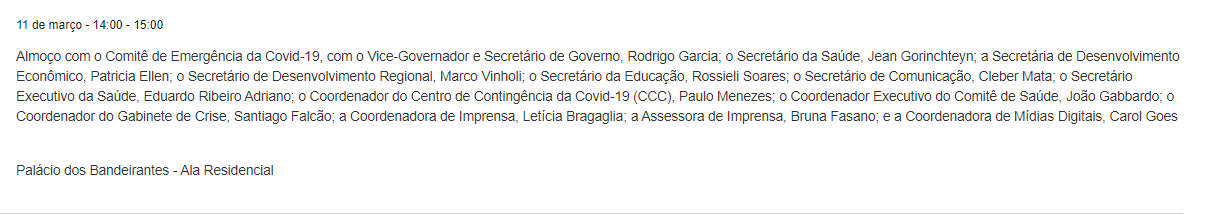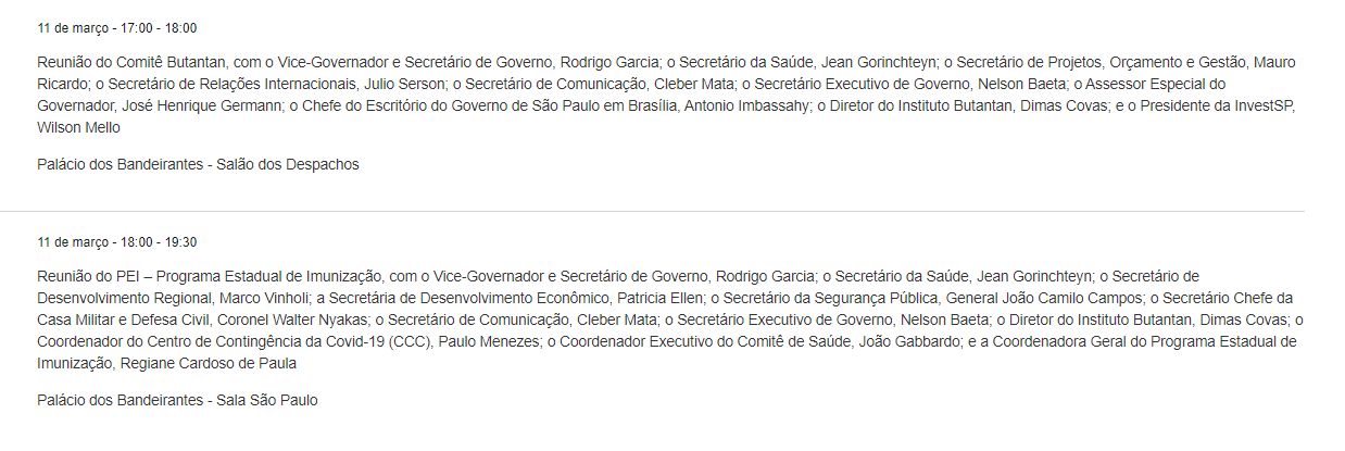 O governador de São Paulo, João Doria (PSDB), sem contar as entrevistas coletivas quase que diárias sobre o avanço da doença no estado, reuniu-se ou participou de ao menos 24 compromissos sobre a pandemia do novo coroanvírus. Na lista, há reuniões com secretários, visitas ao Instituto Butantan, que fabrica a CoronaVac no Brasil, além de encontros com produtores de oxigênio.