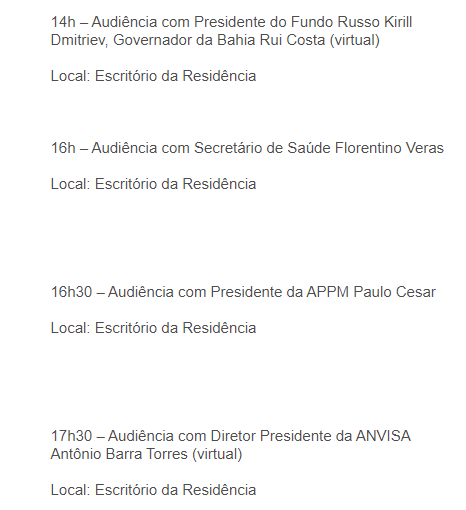 Nos encontros oficiais de Bolsonaro neste mês, ainda houve compromissos com o presidente da Anvisa, Antônio Barros Torres, e virtualmente com Albert Boula, da Pfizer.