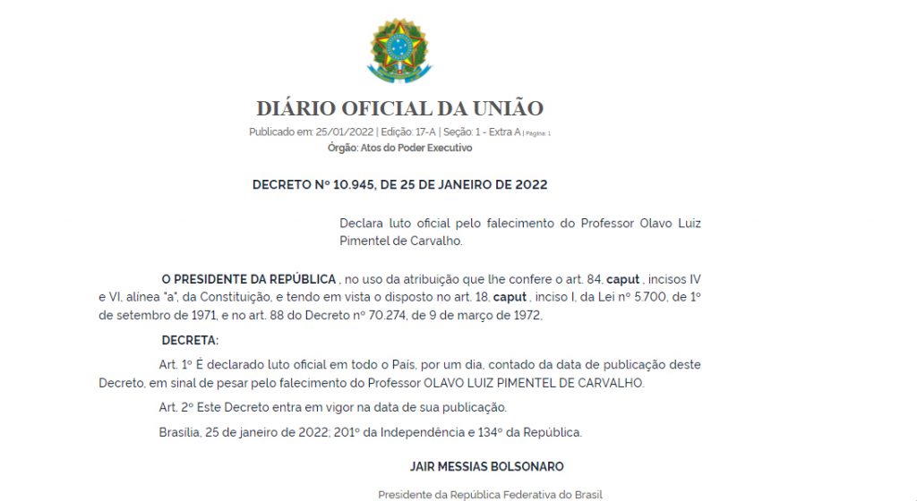 “É declarado luto oficial em todo o País, por um dia, contado da data de publicação deste Decreto, em sinal de pesar pelo falecimento do Professor OLAVO LUIZ PIMENTEL DE CARVALHO”, diz o texto publicado em edição extra do Diário Oficial da União nesta quarta-feira 25.