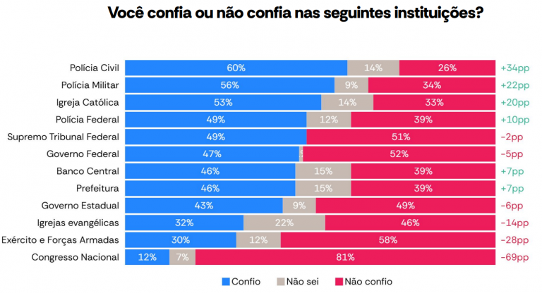 Por outro lado, o Congresso Nacional é, de longe, o pior avaliado entre todas as instituições analisadas: apenas 12% dizem confiar nos deputados e senadores, contra 81% que não confiam. Outros 7% não responderam.