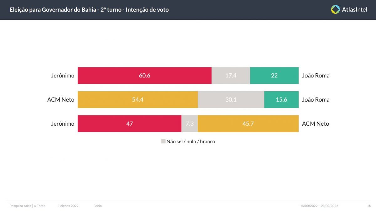 O instituto também monitorou cenários de segundo turno. Segundo a pesquisa, há um empate técnico entre o candidato apoiado pelo ex-presidente Lula (PT), que tem 47%, e ACM, que fica com 45,7%.