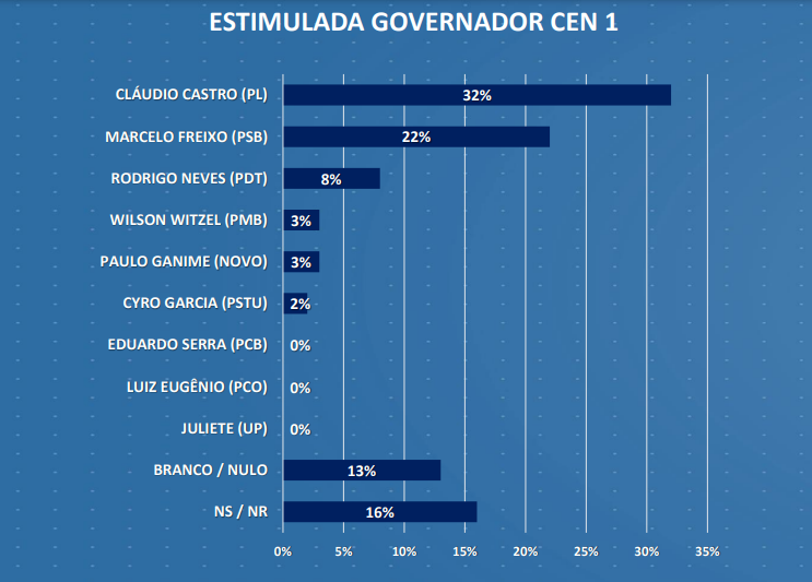 De acordo com o levantamento, Castro tem 32% das intenções de voto contra 22% do pessebista. Na sequência, aparecem Rodrigo Neves (PDT), com 8%, Wilson Witzel (PMB) e Paulo Ganime (Novo), com 3% cada, e Cyro Garcia (PSTU), com 2%. Os demais candidatos não pontuaram.