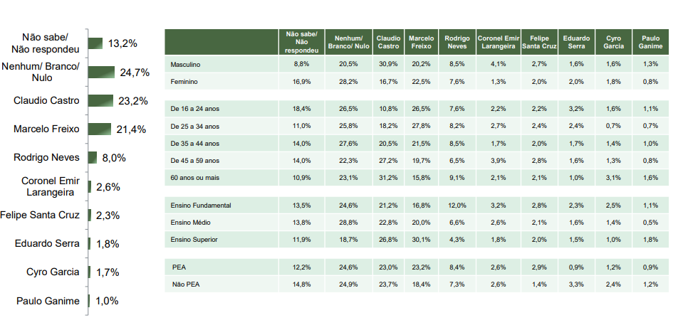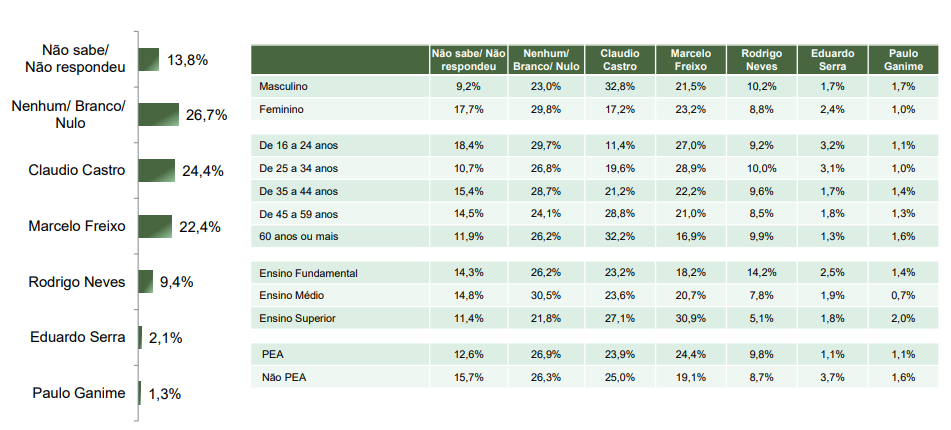 Em um segundo cenário, Castro alcança 24,4% e Freixo fica com 22,4%; Já Neves soma 9,4%.