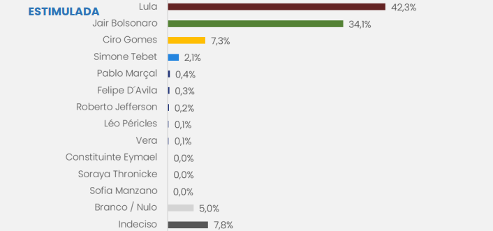 No segundo turno, Lula venceria Bolsonaro por 50,1% x 38,8%. O petista também derrotaria todos os demais adversários. De acordo com o levantamento, 79,6% dos entrevistados disseram que a escolha do voto é definitiva.