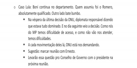 A petição mostra que, em diálogos mantidos pelos procuradores entre 14 a 16 de janeiro de 2019, é “possível verificar que eles realizaram encontros e reuniões com órgãos de Estado, como AGU e CGU, para tratar, dentre outras coisas, de ‘Casos no exterior’, inclusive o Caso ‘Lula ONU’”.