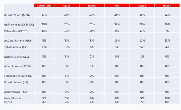 Na divisão por regiões da capital paulista, Boulos apresenta seu melhor desempenho no extremo leste, com 36%. Nessa área, a concentrar o maior número de eleitores (27%), estão bairros como Itaquera, São Mateus, Cidade Tiradentes, Guaianases e Itaim Paulista.