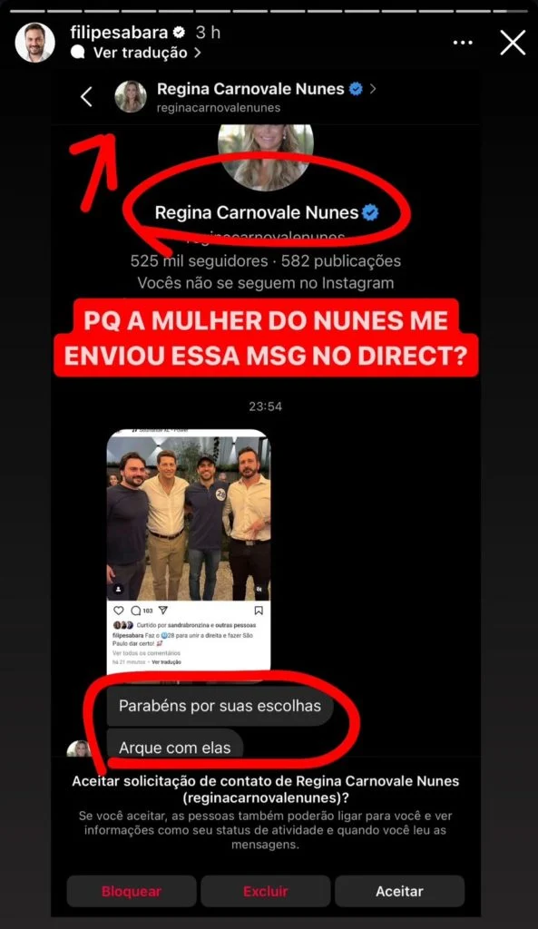 O motivo é uma mensagem enviada por Regina Carnovale Nunes por meio do Instagram. No B.O., obtido pela reportagem, Sabará diz ter se sentido ameaçado de “mal injusto e grave a sua integridade física” após a primeira-dama paulistana escrever que o empresário deveria arcar com suas escolhas.