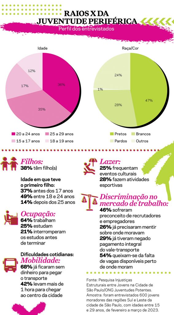Quando esses jovens têm filhos cedo, e isso acontece muito – 37% dos entrevistados se tornaram pais antes de completar a maioridade –, a situação piora. Odara­ Akire tem 19 anos e há dois meses se tornou mãe solo. “Eu era uma prestadora de serviços, com MEI aberta. Fui demitida durante a gravidez. Agora, nas entrevistas de emprego, quando eu falo que tenho um filho vira um pesadelo, as perguntas ficam muito mais agressivas.”