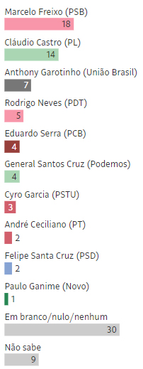 Aparecem na sequência Rodrigo Neves (PDT), com 7%, Eduardo Serra (PCB), com 5%, Cyro Garcia (PSTU), com 4%, Felipe Santa Cruz (PSD), com 3%, e Paulo Ganime (Novo), com 2%.