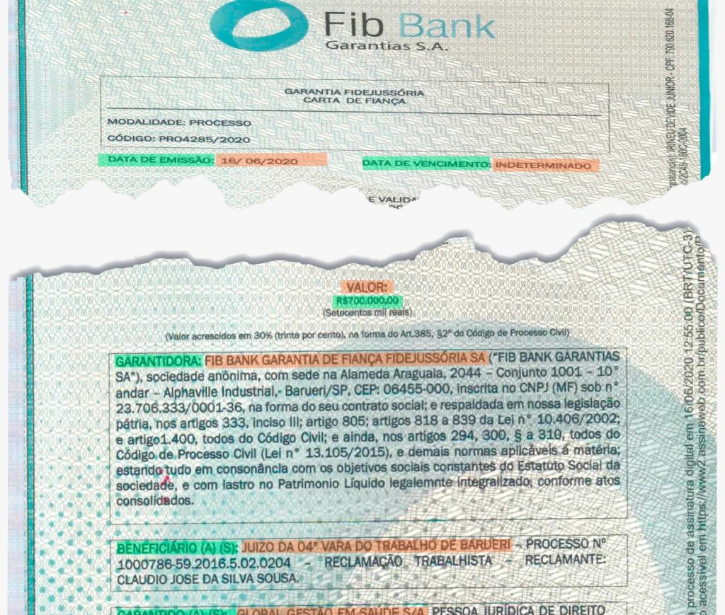 Por fim, existe mais um beneficiário que recebeu, no total, 1,4 milhão de reais em ações trabalhistas contra a Global Saúde durante o período de 4 de julho de 2019 a 16 de junho de 2020: Cláudio José da Silva Souza. Em registros públicos, a última movimentação do processo foi em 9 de setembro deste ano, cinco dias antes da publicação desta reportagem. Todos os valores somados comprovam que, somente em ações trabalhistas, a Global Saúde foi afiançada em 1,9 milhão de reais pelo Fib Bank.