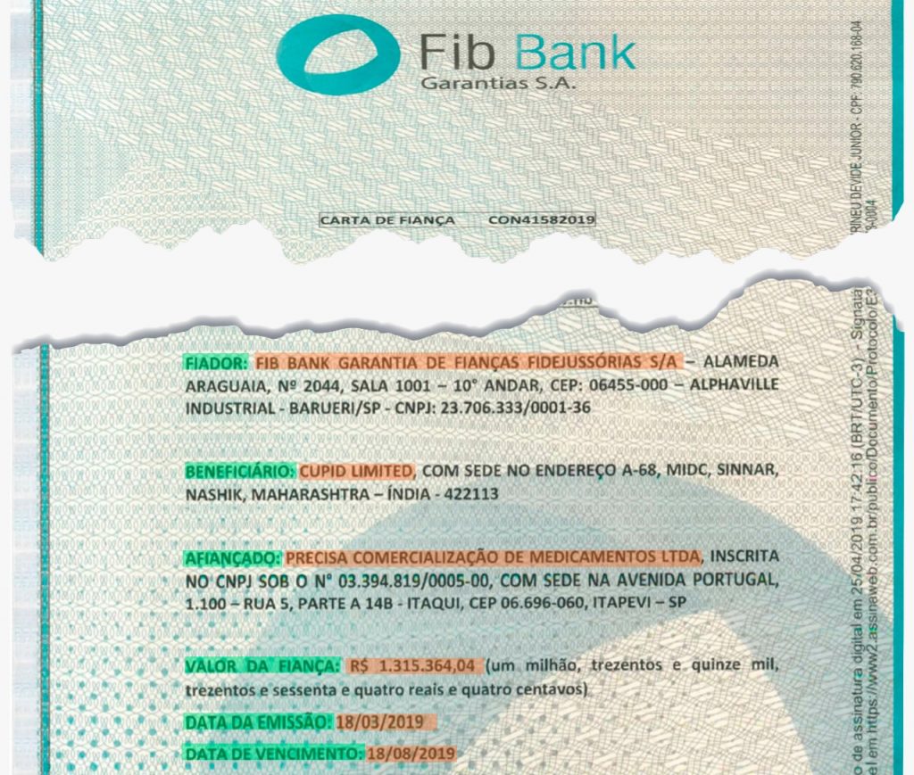 A primeira carta de fiança emitida pelo Fib Bank para a Precisa Medicamentos é relativa a um contrato também considerado suspeito pela CPI da Covid, para a aquisição de preservativos femininos por parte do Ministério da Saúde. O contrato, intermediado pela Precisa com a fabricante indiana Cupid Limited e assinado por Roberto Ferreira Dias, é para a compra de cinco milhões de unidades de preservativos femininos. A primeira carta de fiança equivale a 1,315 milhão de reais.