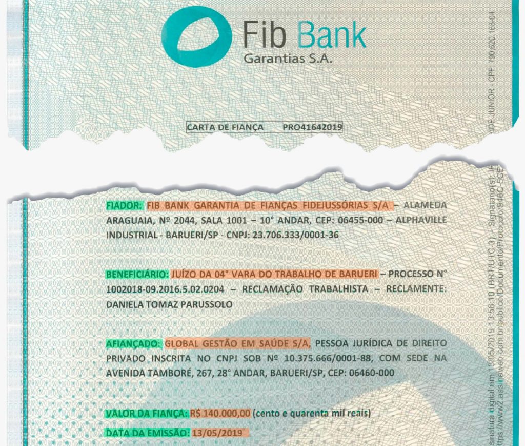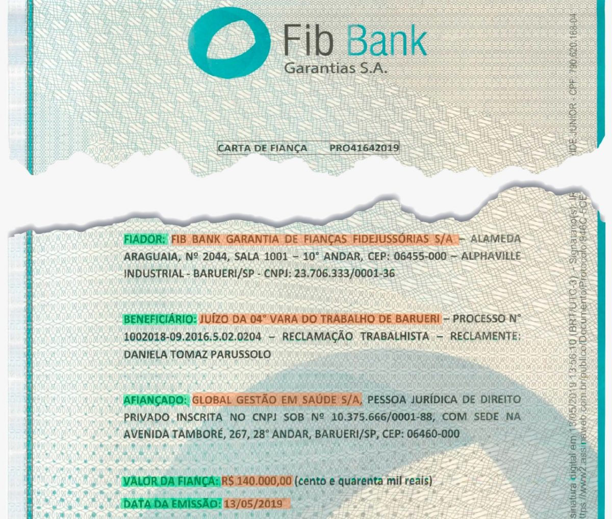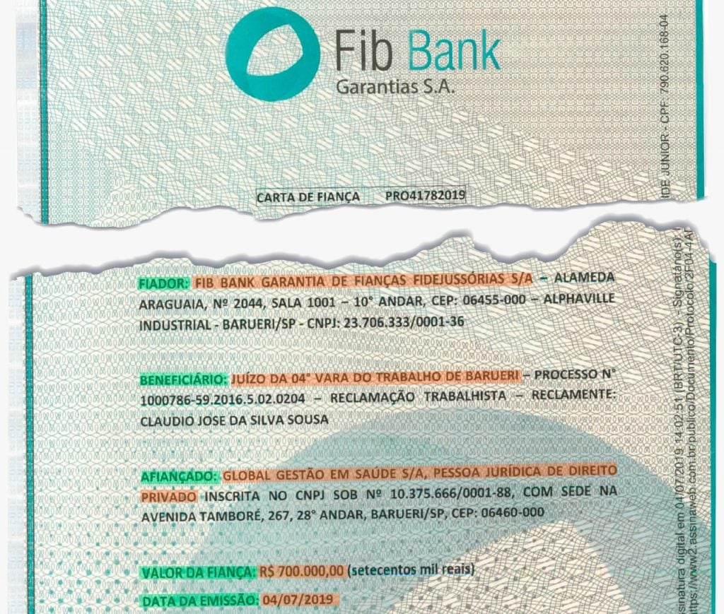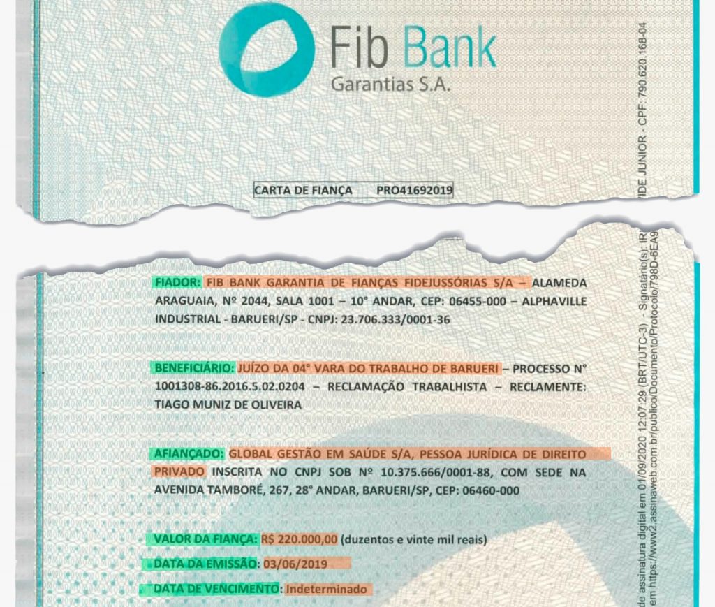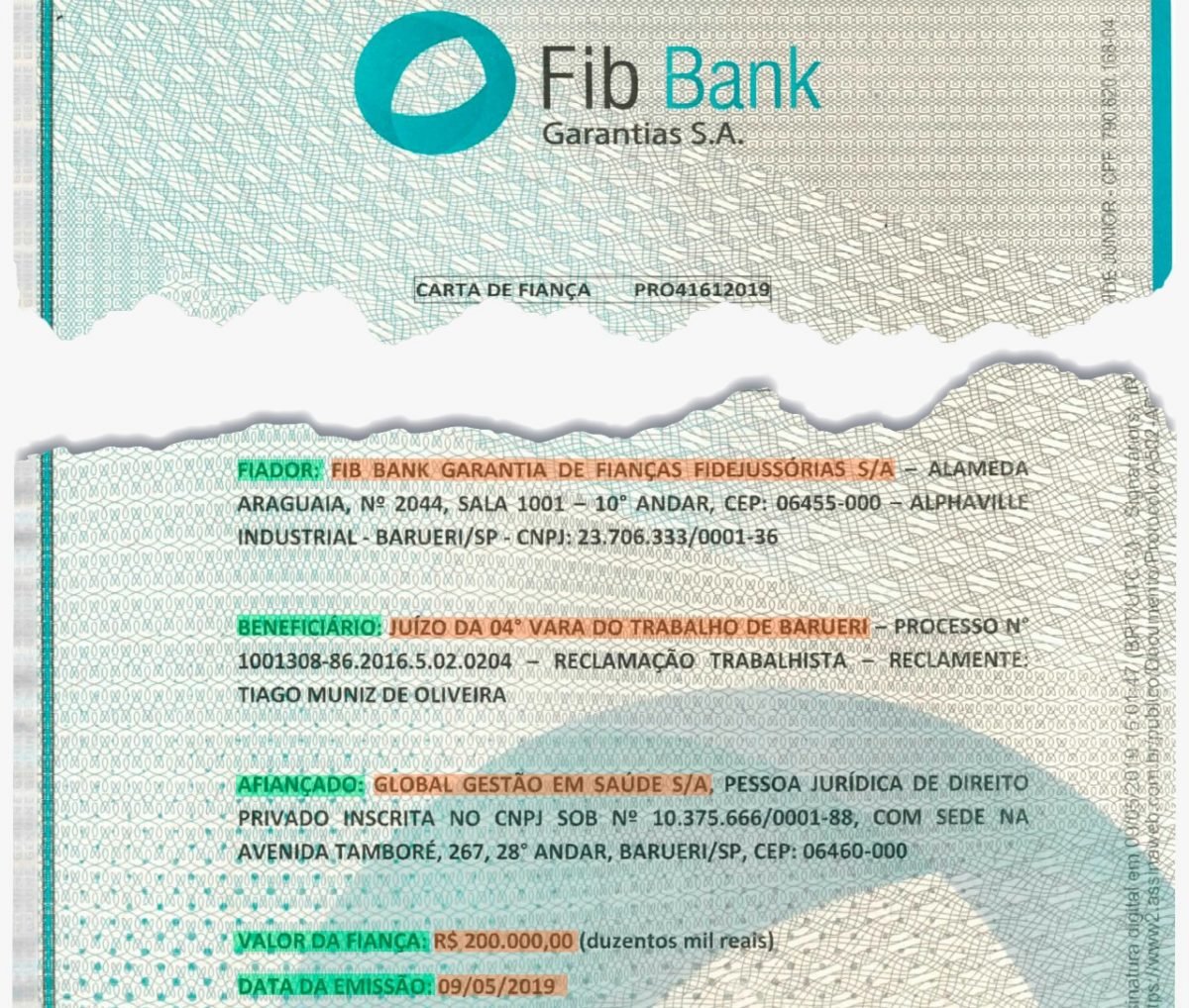 Existem, também, outras cartas de fiança relacionadas a uma ação trabalhista com o mesmo beneficiário e reclamante, Tiago Muniz Oliveira, com a Global Saúde sendo a afiançada. No total, as cartas somam 420 mil reais.