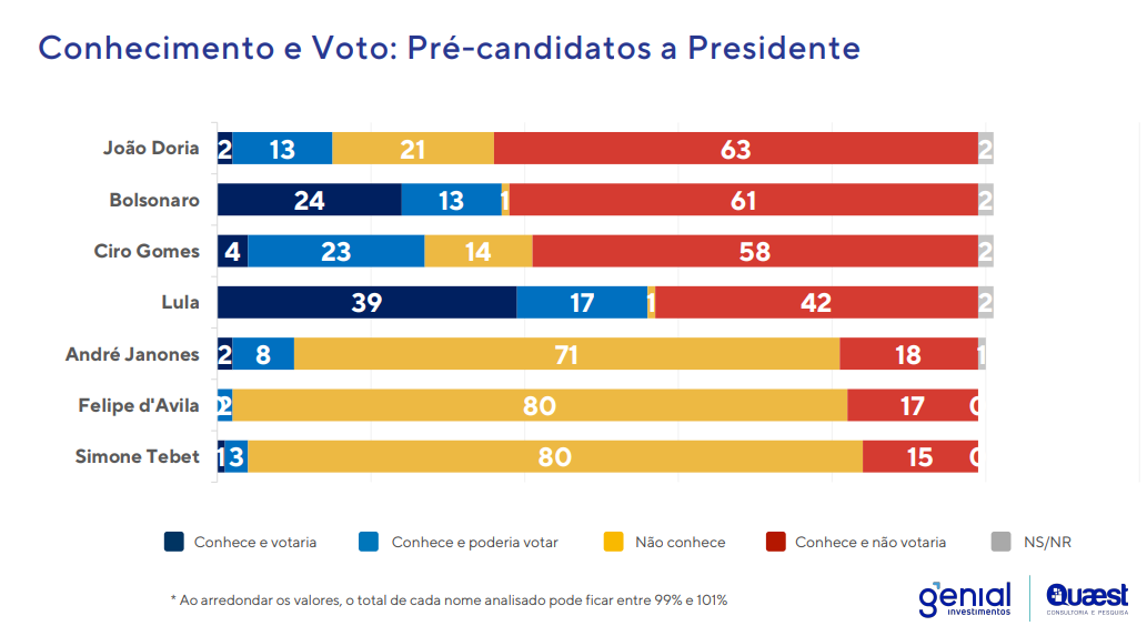 A pesquisa Genial/Quaest que mostra a liderança do ex-presidente Lula, divulgada nesta quinta-feira 7, também aponta que o petista, entre os candidatos mais conhecidos, é o que tem a menor rejeição.