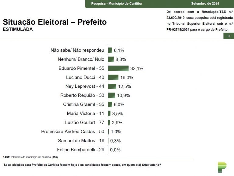 De acordo com a pesquisa, Pimentel tem 32,1% das intenções de voto. O político é o atual vice-prefeito da cidade e conta com os apoios do prefeito Rafael Greca (PSD), do governador Ratinho Jr. (PSD) e do ex-presidente Jair Bolsonaro (PL), cujo partido indicou o vice na chapa.
