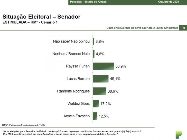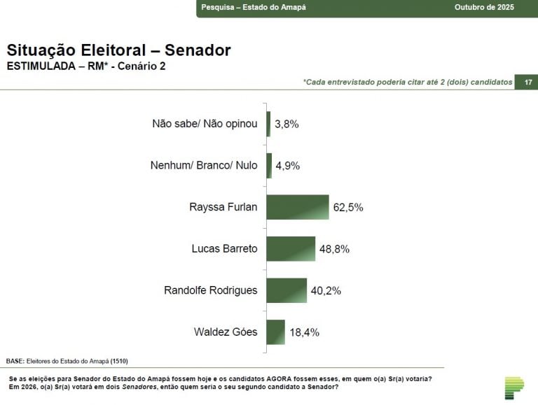 De acordo com os resultados, Rayssa tem 60,9% das intenções de voto no principal cenário monitorado pelo levantamento. Ela ficaria, portanto, com uma das duas cadeiras em disputa na eleição. A segunda vaga seria ocupada, de acordo com a pesquisa, pelo senador Lucas Barreto (PSD). O parlamentar soma 45,1% da preferência do eleitorado.
