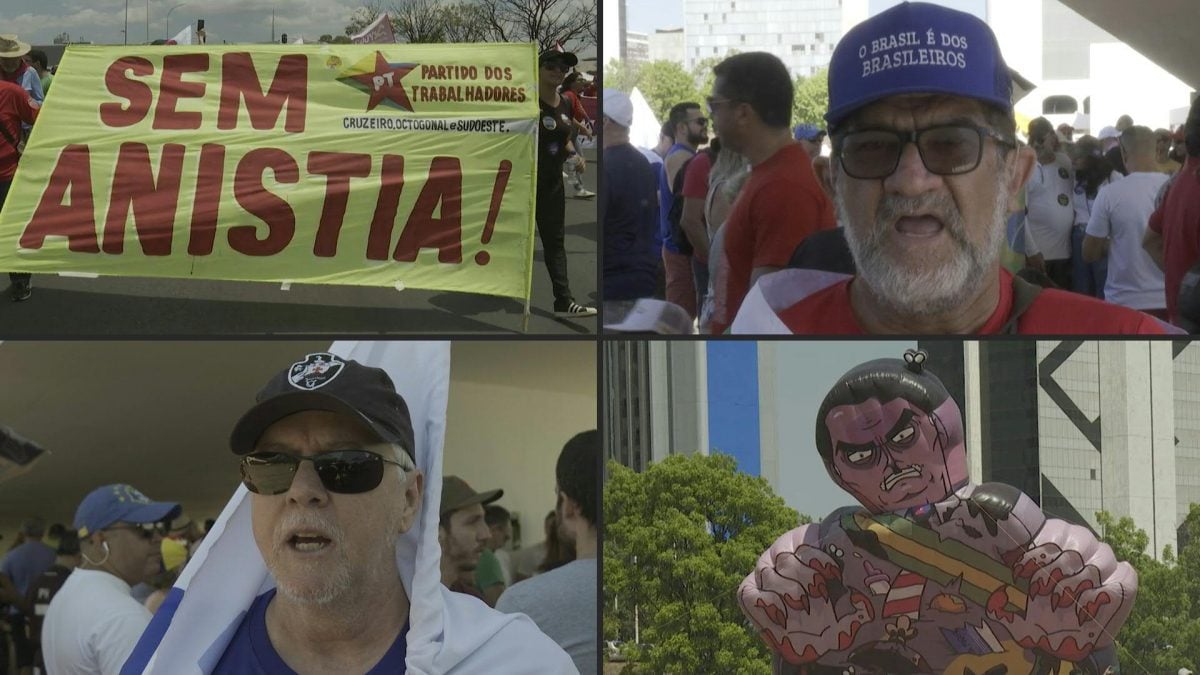 Milhares de pessoas foram às ruas protestar neste domingo contra a PEC da Blindagem e um projeto de anistia que poderia beneficiar Jair Bolsonaro, condenado a 27 anos de prisão (Imagens: AFP)