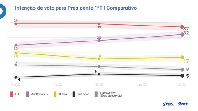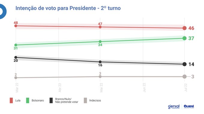 “Na simulação de 2º turno para presidente, a distância de Lula e Bolsonaro saiu de 17 pontos para 6 pontos, caiu nos últimos dois meses”, escreveu Felipe Nunes, diretor do instituto.