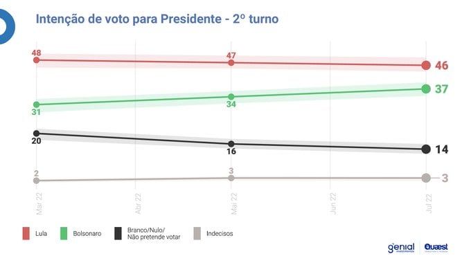 Para chegar aos resultados, o instituto entrevistou 1.640 eleitores entre os dias 1 e 4 de julho. A margem de erro é de 2,4 pontos percentuais para mais ou para menos. O levantamento tem 95% de confiança.