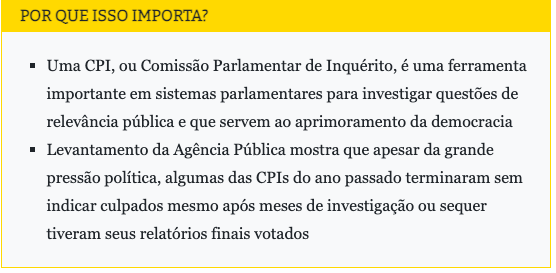 A Câmara foi responsável por 4 das 7 comissões de inquérito do Congresso no ano passado. Desse total, duas terminaram sem apreciação do relatório final, a das Apostas Esportivas e a do MST (Movimento dos Trabalhadores Rurais Sem Terra). Também em 2023, além das sete CPIs instaladas, os deputados coletaram o número mínimo de assinaturas, 171, para a criação de outras sete comissões.