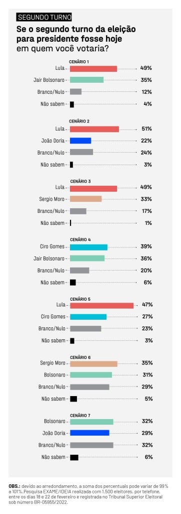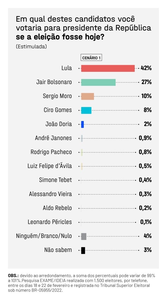 O levantamento mostrou ainda que o ex-presidente Lula lidera a corrida eleitoral, com 42%. Em terceiro, aparece o ex-juiz Sergio Moro (Podemos), com 10%, e, em quarto, Ciro Gomes (PDT), com 8%.
