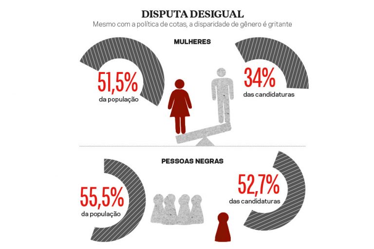 De acordo com o IBGE, 55,5% da população brasileira é formada por pretos e pardos. Nas eleições deste ano, 240,5 mil candidatos se autodeclararam pretos e pardos ao TSE, 52,7% do total. O PCdoB é a legenda com maior porcentual de candidaturas negras, embora tenha pouco mais de 3 mil candidatos, em torno de 1,2 mil mulheres e 1,8 mil homens. Entre as mulheres, 79,2% são negras e 73,4% são negros. “Defendemos que os espaços de poder devem refletir a diversidade que constitui o povo brasileiro. O combate ao racismo e a luta pela liberdade feminina são parte integrante do projeto de emancipação social e nacional do nosso partido. Por isso, atuamos para que essas parcelas da população, hoje sub-representadas, ocupem a política, o Parlamento e os cargos de gestão, pois assim, com a participação dos diversos olhares, conseguiremos construir uma sociedade com maior equidade e justiça social”, destaca Luciana Santos, presidente nacional do PCdoB e ministra de Ciência e Tecnologia. “Quando a gente olha a presença maior de candidaturas de negros ou de mulheres, mas principalmente negros, vê que está num partido pequeno. E o que significa? Não adianta lançar aquelas candidaturas, porque o partido não é muito competitivo”, opina Marques.