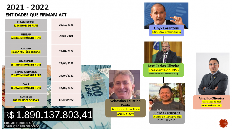 Além desses operadores, o relatório menciona a atuação de servidores e ex-integrantes do governo Bolsonaro, incluindo figuras que ocuparam cargos no INSS e no Ministério do Trabalho e da Previdência. Entre os citados está o ex-ministro Onyx Lorenzoni, associado a episódios envolvendo doações eleitorais e relações com entidades investigadas.