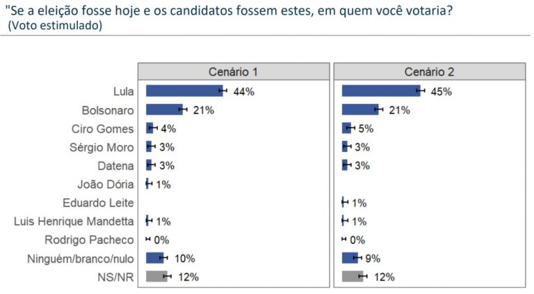 Após Lula e Bolsonaro, quem aparece melhor na disputa é Ciro Gomes (PDT) com 4% e 5%. Sergio Moro (Podemos) e José Luiz Datena (PSD) têm 3%, independentemente do cenário. João Doria (PSDB), Eduardo Leite (PSDB) e Luiz Henrique Mandetta (DEM) aparecem com apenas 1%. Rodrigo Pacheco (PSD) não pontuou.