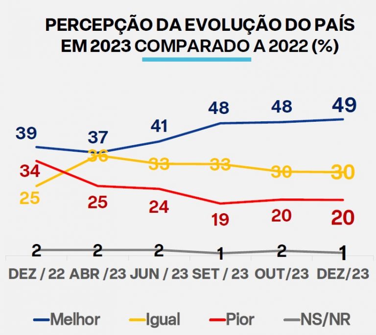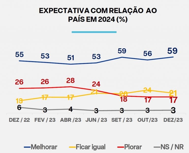 O levantamento desta sexta-feira também mostrou uma alta no otimismo da população para 2024. “Quase seis em cada dez entrevistados 59 acreditam que o Brasil vai melhorar em 2024 quatro pontos a mais que no mesmo período de 2022 55 quando o país avistava a posse do Presidente eleito”, destaca o Ipespe.