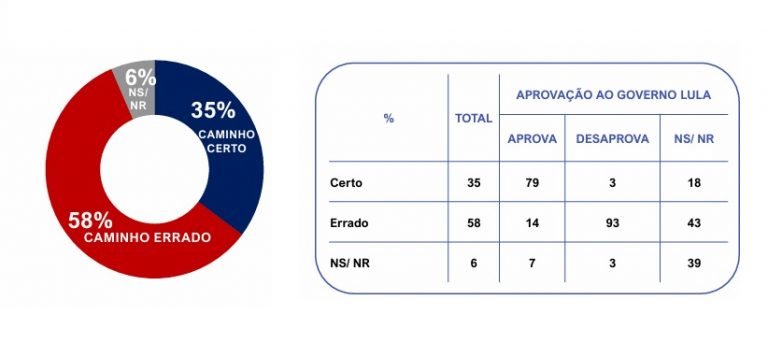 O instituto também quis saber a percepção dos brasileiros sobre a condução da economia sob o petista. Cerca de 58% dos entrevistados afirmam que a política econômica está no caminho errado ante 35% que a veem no caminho certo. São 6% os que não quiseram responder. Veja os números: