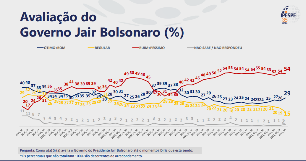 Além da avaliação, o Ipespe também pesquisou a aprovação do governo federal. Segundo o levantamento, 63% dos entrevistados responderam que desaprovam a gestão de Bolsonaro. Por outro lado, 33% aprovam.