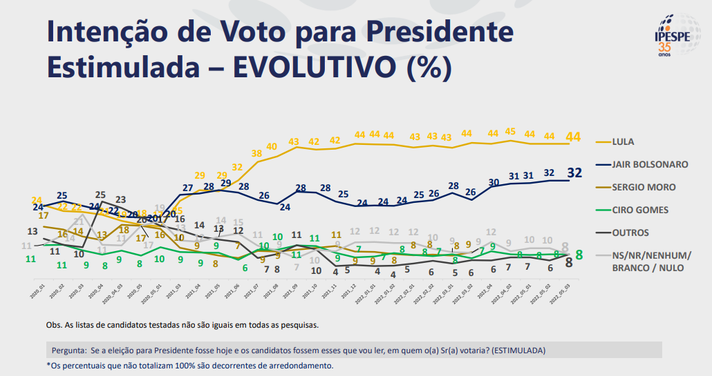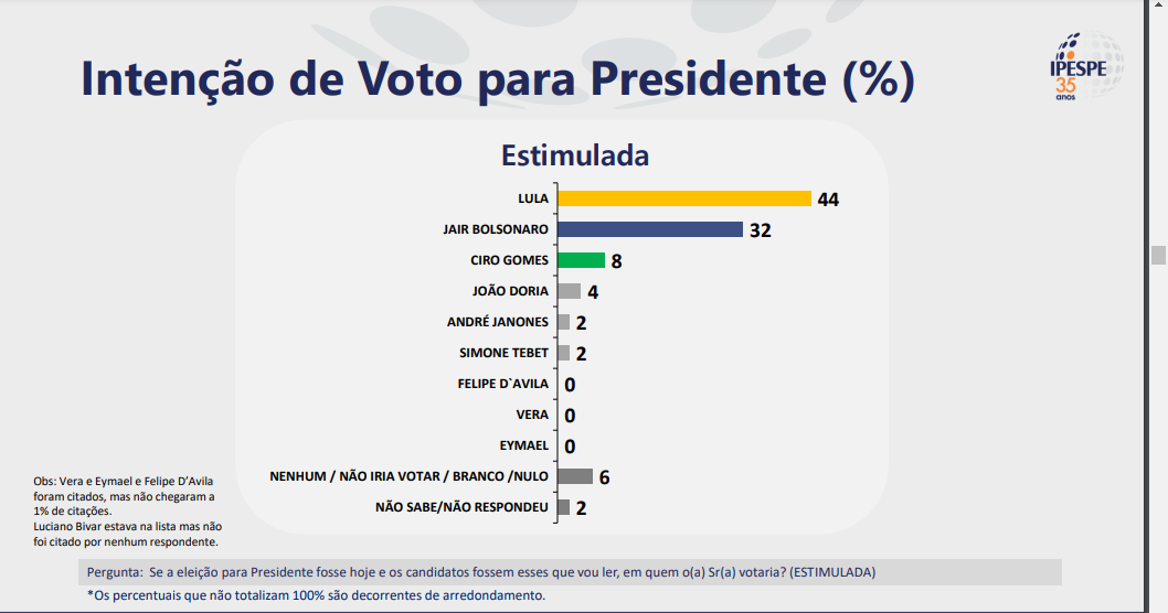 Ipespe: Bolsonaro para de crescer e Lula segue líder com 44% das intenções de voto