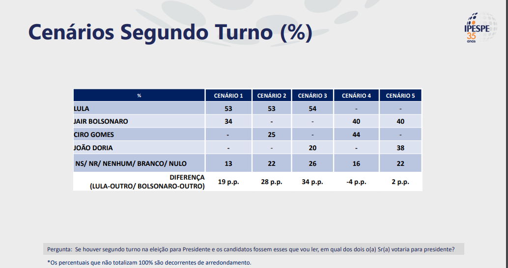 No segundo turno, de acordo com o levantamento, Lula venceria Bolsonaro por 53% x 34%. O petista é o único pré-candidato que não seria derrotado por nenhum oponente.