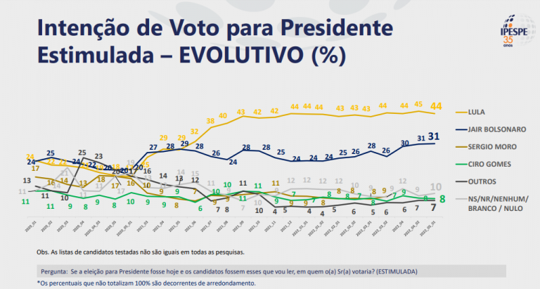 Ipespe: Lula consolida liderança e distância para Bolsonaro é de 13 pontos
