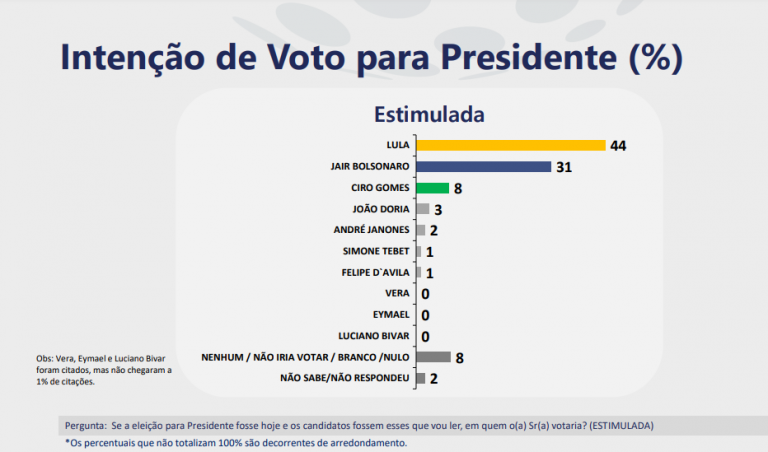 A pesquisa revela, ainda, que Lula venceria todos os adversários no segundo turno. Contra Bolsonaro, o petista teria 54% e o atual presidente ficaria com 34%.