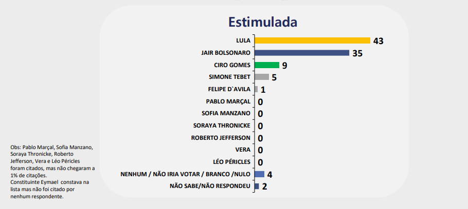 O pedetista Ciro Gomes tem 9% e é seguido por Simone Tebet (MDB), com 5%, e Luiz Felipe D’Aavila (Novo), com 1%. Os demais candidatos não pontuaram.