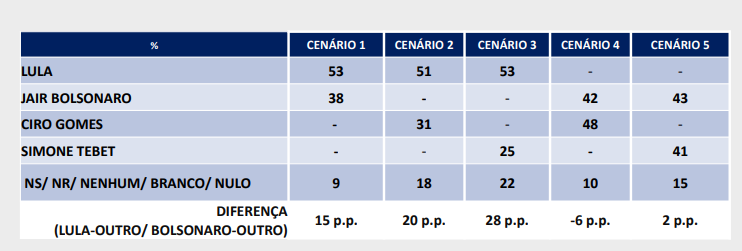 O Ipespe também monitorou os cenários de segundo turno. Em todos eles, Lula sai vitorioso. Contra Bolsonaro, o petista teria 53% contra 38% do atual presidente. Ciro seria derrotado por 51% x 31%. Já Tebet perderia por 53% x 25%.