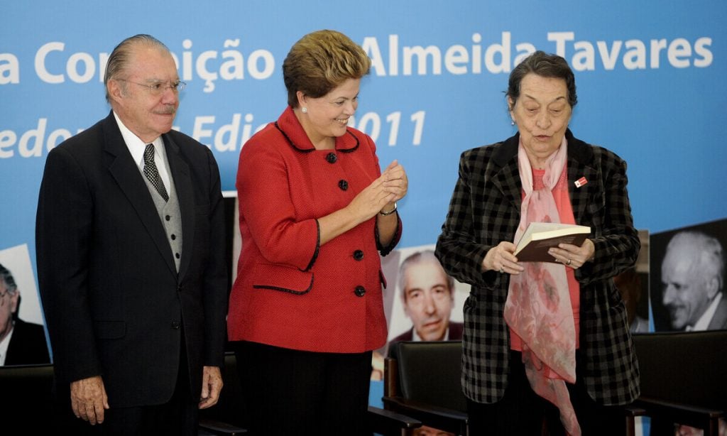 Maria da Conceição Tavares recebeu o prêmio Almirante Álvaro Alberto para Ciência e Tecnologia, em cerimônia com o presidente do Senado, José Sarney (PMDB-AP), e a presidente da República, Dilma Rousseff (PT), em 2012. Foto: Jane de Araújo/Agência Senado