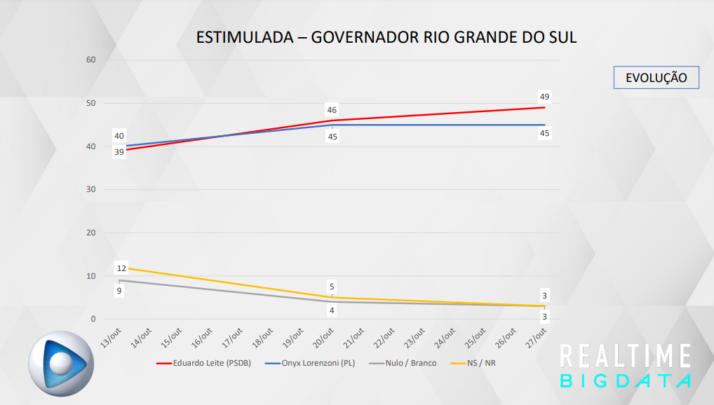 O ex-governador do Rio Grande do Sul Eduardo Leite (PSDB) lidera o segundo turno no estado com 49% das intenções de voto, de acordo com pesquisa Real Time Big Data divulgada nesta quinta-feira 27.