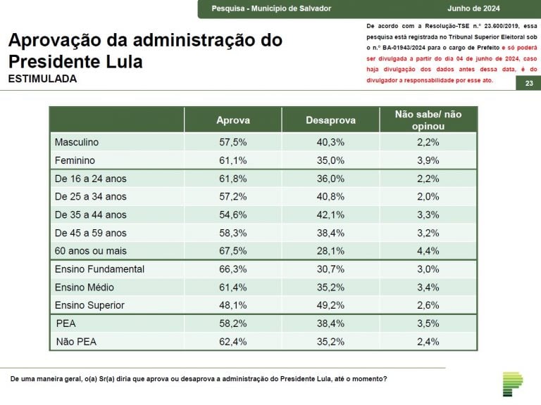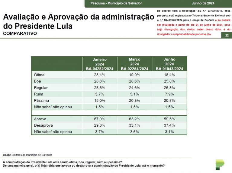 O trabalho do presidente Lula (PT) é aprovado por quase 60% dos eleitores de Salvador, capital da Bahia. A conclusão consta no novo levantamento do instituto Paraná Pesquisas com eleitores da cidade.