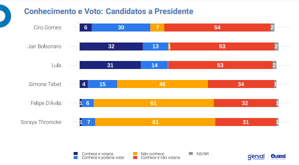A Quaest também mensurou a rejeição dos presidenciáveis. Segundo a pesquisa, 53% dos eleitores paulistas conhecem e não votariam de jeito nenhum em Lula e Bolsonaro. Os líderes da pesquisa, neste item, só perde para Ciro, que tem 54%.
