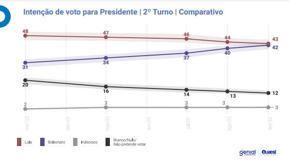O instituto ainda monitorou um cenário de segundo turno entre Lula e Bolsonaro. Há, também um empate técnico, mas com o petista numericamente à frente com 43% contra 42% do atual presidente.