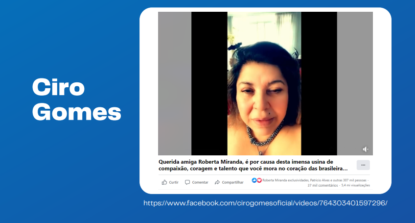Entre os demais pré-candidatos, embora distantes de Bolsonaro e Lula, destacam-se Ciro Gomes (PDT) e Pablo Marçal (PROS). É do pedetista, inclusive, a publicação com mais interações no Facebook no período analisado: um depoimento da cantora Roberta Miranda.