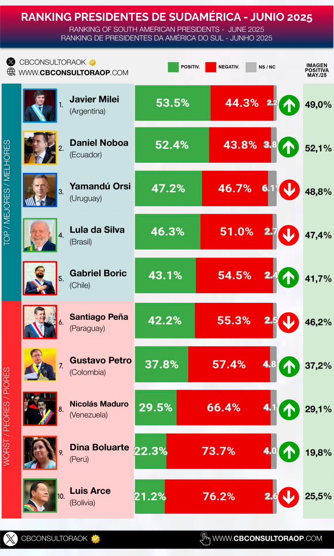 Houve, porém, uma mudança no topo do levantamento: o argentino Javier Milei subiu de segundo para primeiro, com 53,5% de imagem positiva, ante 52,4% do equatoriano Daniel Noboa, que liderava a sondagem no mês passado. Em terceiro lugar continua o uruguaio Yamandú Orsi, com 47,2%, enquanto o chileno Gabriel Boric completa o top 5, com 43,1%.