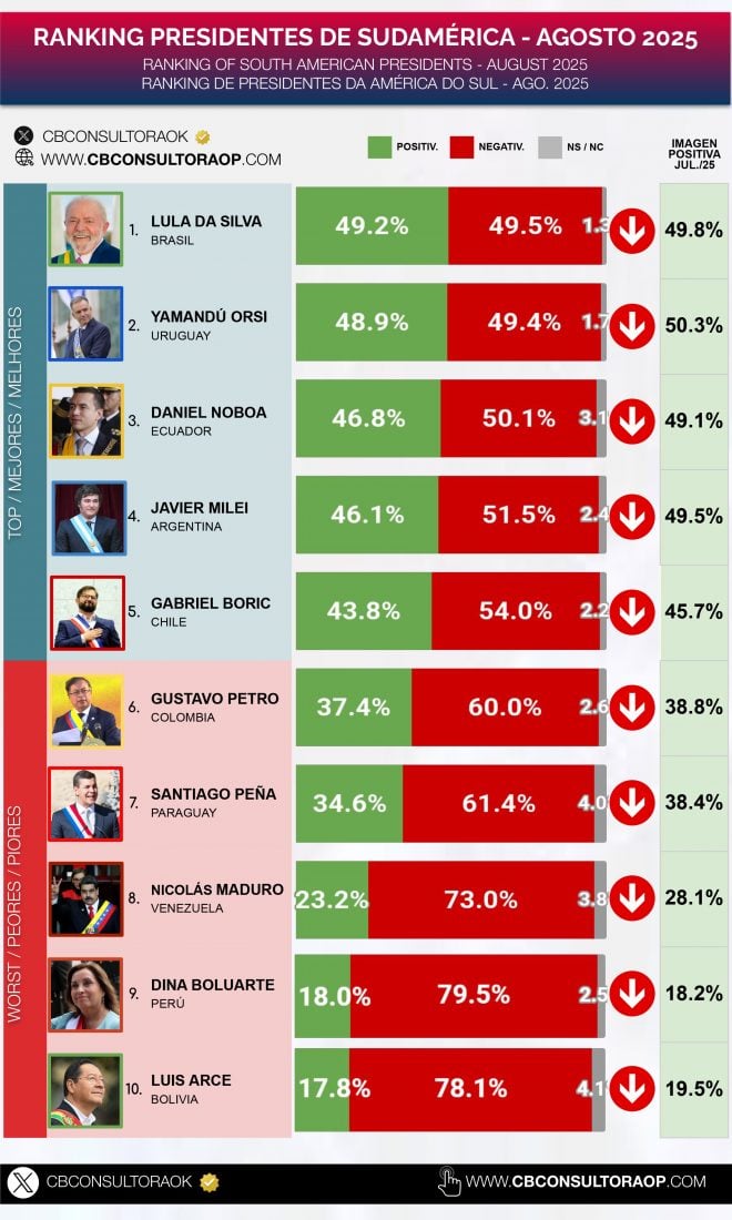 O presidente Lula (PT) subiu uma posição e é o presidente mais popular da América do Sul em agosto, segundo um monitoramento atualizado mensalmente pela CB Consultoria Opinión Pública, da Argentina. Ele marca 49,2% de imagem positiva e 49,5% de negativa.