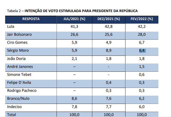 A liderança segue com o ex-presidente Lula, com 42,2%. Em dezembro, o petista marcou 42,8%.
