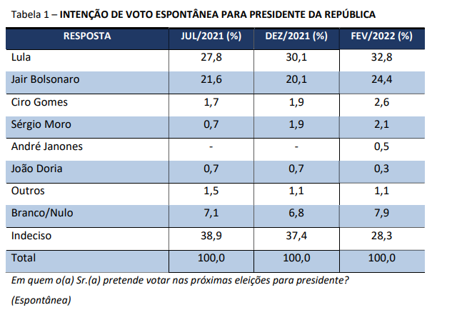 De acordo com o levantamento, o ex-capitão saiu de 25,6% em dezembro de 2021 para 28% em fevereiro deste ano